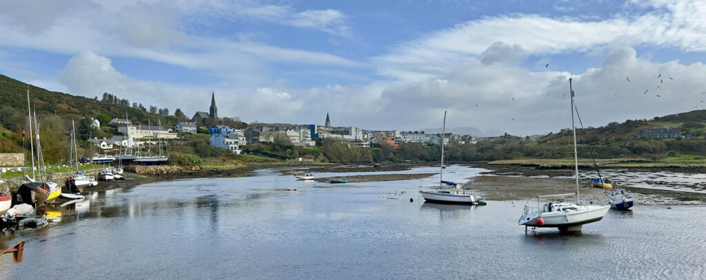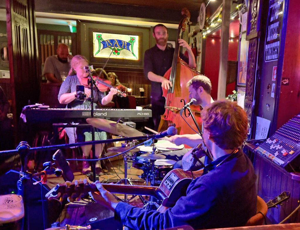 The weather was beginning to deteriorate by the next morning, as we drove on to Clifden for more great music and food. After a night there our plan was then to continue on to Westport. Storm Amy had other plans, however, and we soon found the roads to be flooded and impassable as we tried to drive out of Clifden. Fortunately, we found accommodation in Clifden, in a lovely converted Quay house on the edge of the bay. It was owned by a French family who had filled the house with quirky paintings, antiques and stuffed animals. To cap it, we had another great meal in town, at a restaurant recommended by the Quay house owner, then spent the late evening in a bar listening to a local band – the House Cats – who had just released their first album on Spotify, and who were fantastic: our third live band in the first three days!