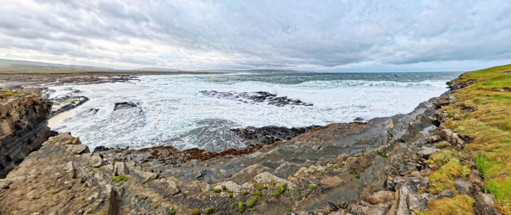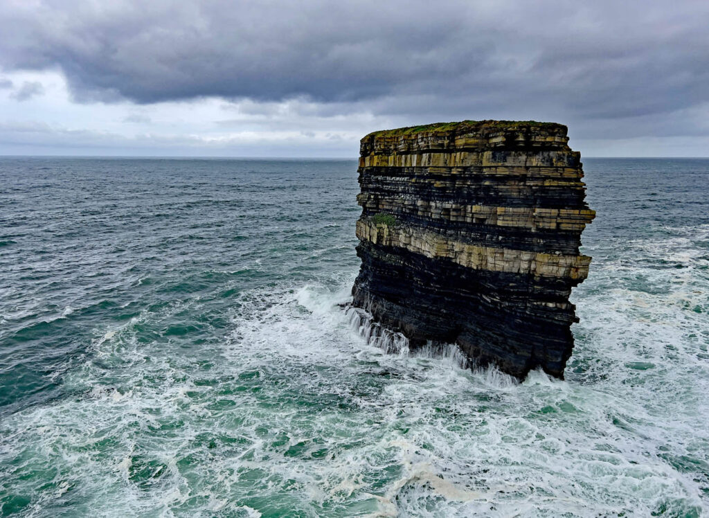 We nearly spent a third night in Clifden – the road back out to Galway was still flooded when we tried to leave. Luckily, we found an alternative route and drove to Swinford, stopping at Knock airport to pick up Cate’s brother, David. Their aunt, Margaret, very kindly had us to stay in her house. We also, and unexpectedly, got to see two of Cate’s uncles, Liam who was visiting from England, and Val who lives in Swinford, and Cate’s aunt Tina, visiting with her husband Donal from Clifden, giving Cate and David an opportunity to catch up with the family news. We had time to take a trip out to Downpatrick head, with the seas still fierce in the aftermath of the storm, and all too soon we were back on the road to Dublin.