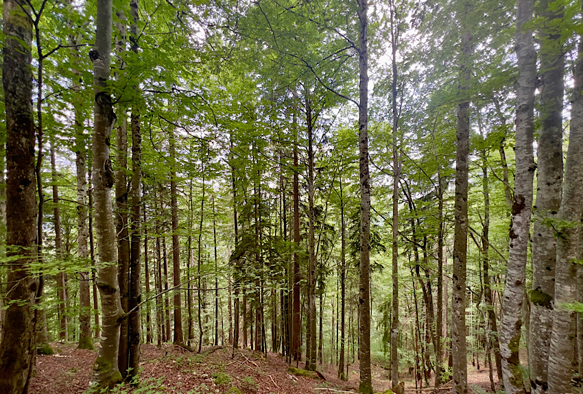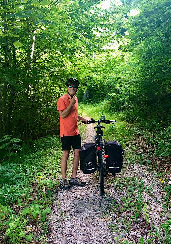 Today we departed our hotel at the crack of dawn, hoping that the legs along the busy N5 would be quiet on a Sunday morning. Indeed the road was less busy than yesterday but we faced a steady climb of 900m over 35km trying to hug the hard shoulder and avoid debris of glass and gravel. We still made good progress but by mid morning the traffic was building. Both Google maps and our cycling app suggested an alternative so we turned off the main road – only to find a steep gravel track. We managed to push our bikes up the rough terrain, crossing a small stream and skidding back down a few times before we joined a proper road. From there it was a lovely trip through the forest making a steady ascent to Les Rousses.