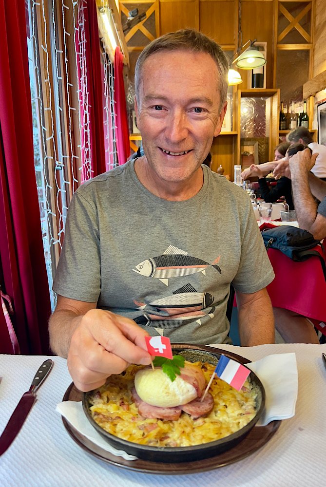 The trip had taken less time than expected so we stopped in Les Rousses. The village is a ski resort but at only 1200m it must have a limited season. In the summer it is full of cyclists, all racing past at high speed on their carbon bikes. Still there were lots of restaurants so we stopped for a marvellous lunch. Unfortunately, almost immediately after we left, and with only 3.5km to our hotel, we could see storm clouds approaching. We barely had time to don our waterproofs before the heavens opened – with thunder, lightning, lashing rain and hail.