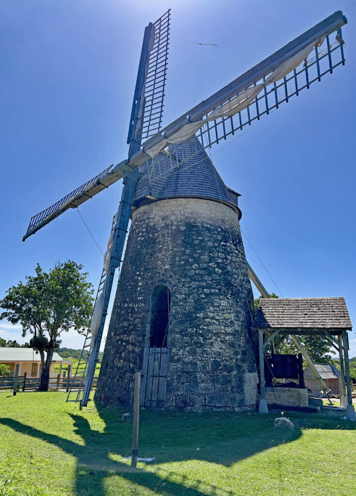 Our drive took us along the coast to the North of the island, where we stopped to visit the (locally) famous Gueule Grand Gouffre, a natural bridge in the cliff formed by erosion, then across to the centre of the island for visits to ancient (and no longer working) windmills and a rum distillery. We stopped for a delicious seafood lunch – tataki of Marlin – at a restaurant in the resort town of Capesterre in the Southeast of the island, and admired the expert kite surfers who blasted across the bay performing aerial tricks as they went.