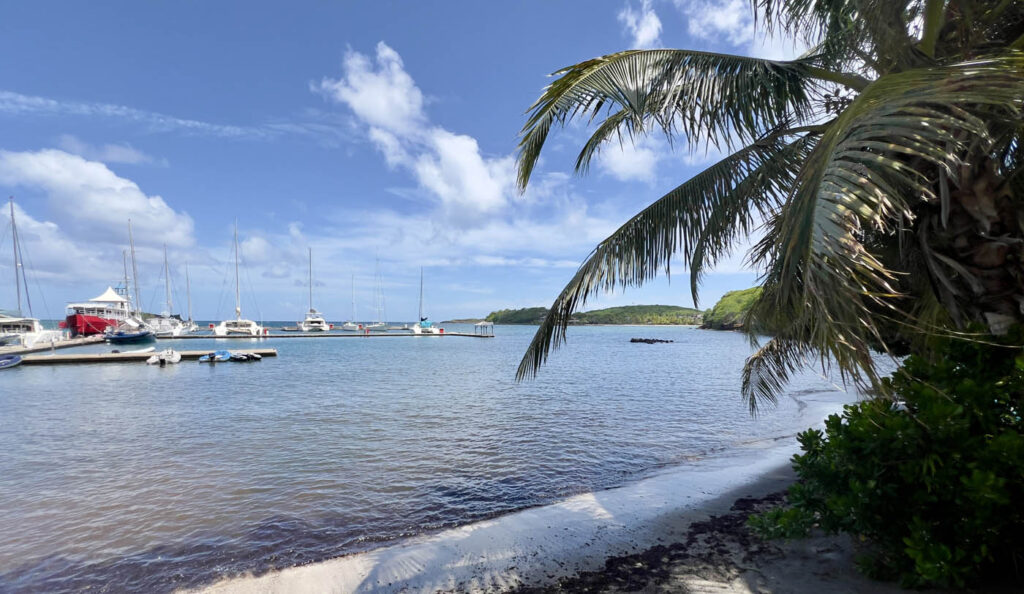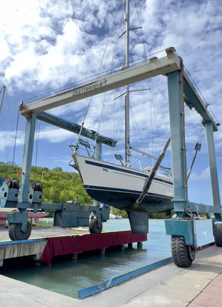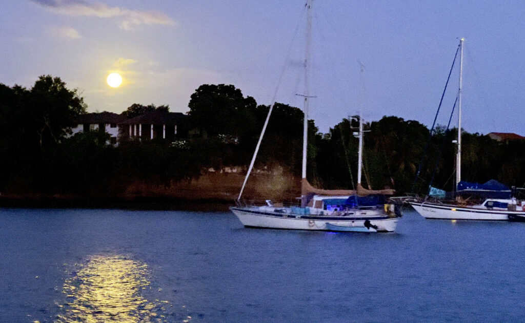 The first couple of days in Prickly bay were relaxing and we enjoyed daily swims and the occasional trip ashore. The evenings, with a full moon rising, were especially beautiful. With each passing day, however, the winds and swell started to pick up, and we eventually abandoned the anchorage after about five days to seek better shelter in Port Louis Marina, just around the corner of the island. Once there, our work began! We took down the foresails and  running rigging, pickled the water maker, serviced the engine, scrubbed the decks and applied anti fungal paint (vital in the humid climate), and generally cleaned and stowed everything in preparation for leaving Merryn on the hard during the Hurricane season. Once the work was done, it was time to return to Prickly bay for one final night before going into the boatyard. There we faced an interesting challenge. We had decided to leave the mainsail up for the trip round to Prickly bay from the marina (it provides greater stability for the boat even when motoring, and is a vital safety precaution in case of engine failure). That meant we had to drop and remove the mainsail on the boat at anchor, rather than in the shelter of a marina. We waited all day for a lull in the wind, then got the sails down, wrestling with vast swathes of sail to fold and bundle it up – surprisingly well, and we celebrated with a glass of champagne (coincidentally, it happened to be our wedding anniversary too)!