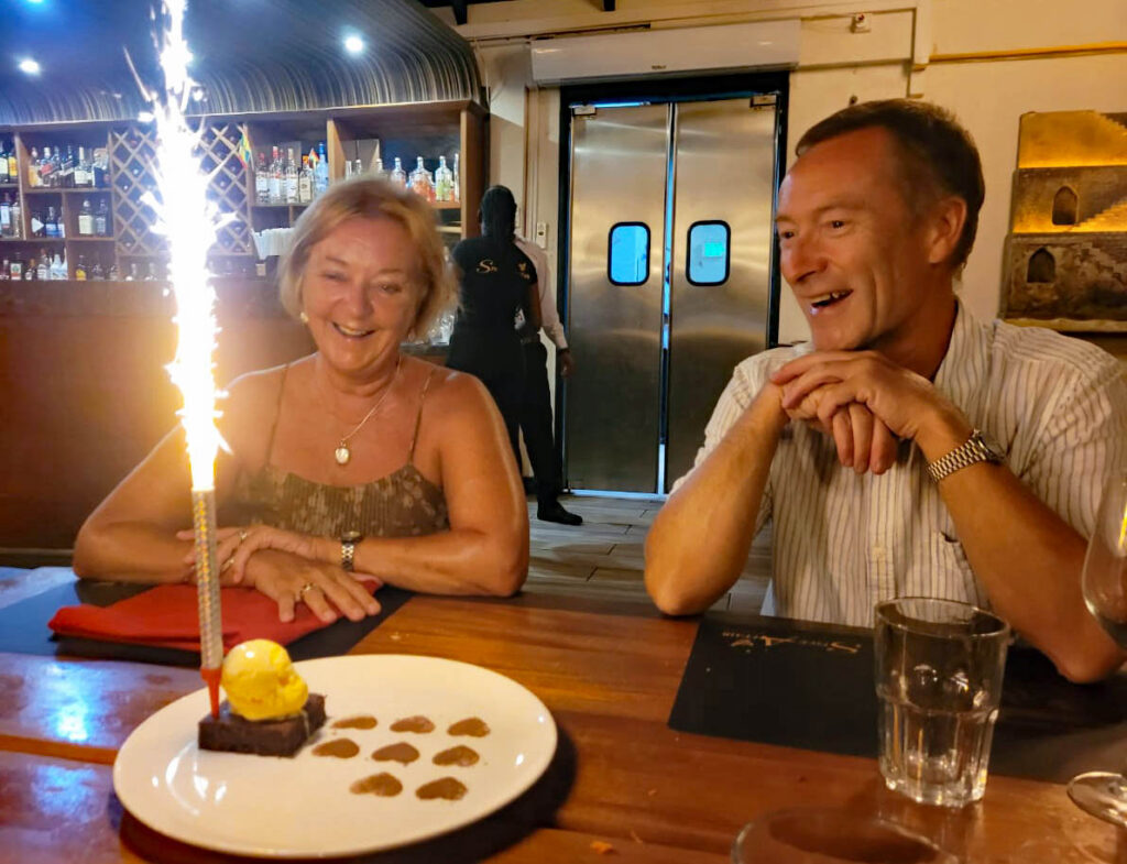 On the 23rd of May Merryn was hoisted ashore at the boatyard at the head of Prickly bay, and we moved to an apartment nearby, allowing us to complete the preparations for the off-season. All was not work, however, as we discovered still more Viking sailors – Satomi and Rob (double-handers like ourselves) had returned to Grenada and were at anchor in Prickly bay. We met up for a lovely evening, swapping tales of our sailing routes. For our part, it was really useful to get their insights into good places to visit in the Leeward islands, which they had reached this season, and where we hope to sail next year. The four of us went out for a curry and were treated to a celebration cake!