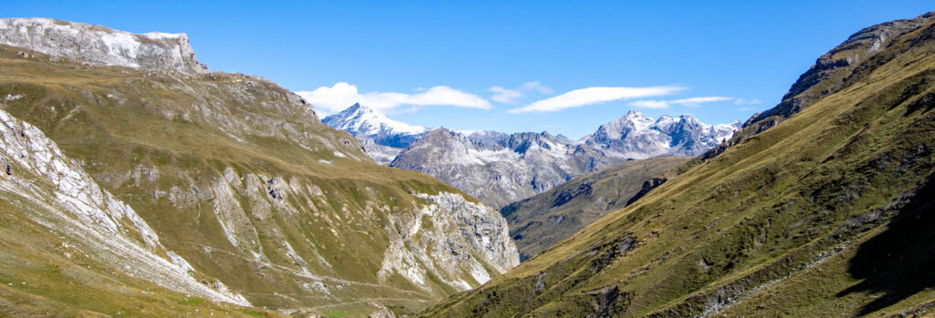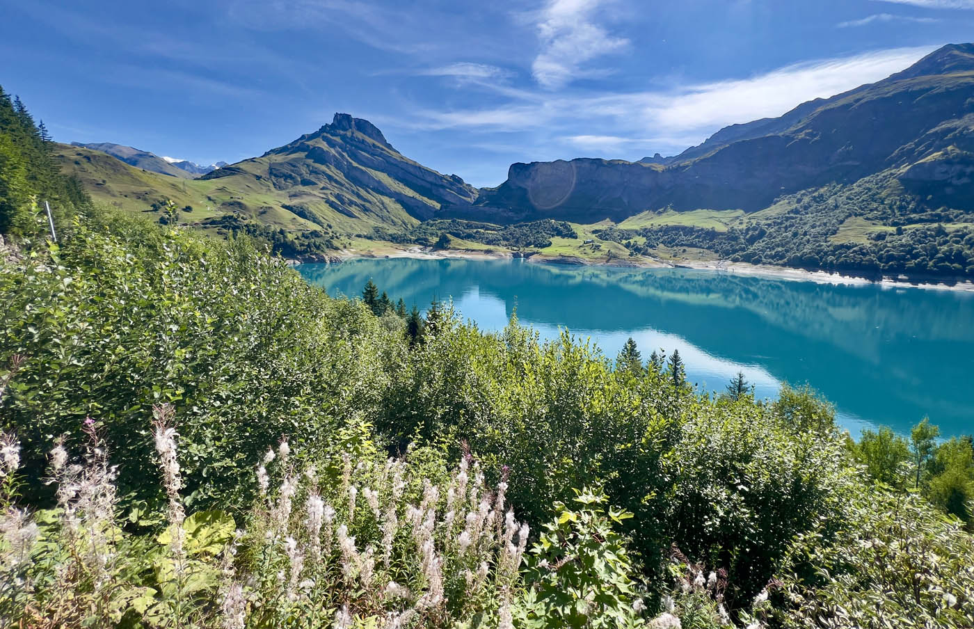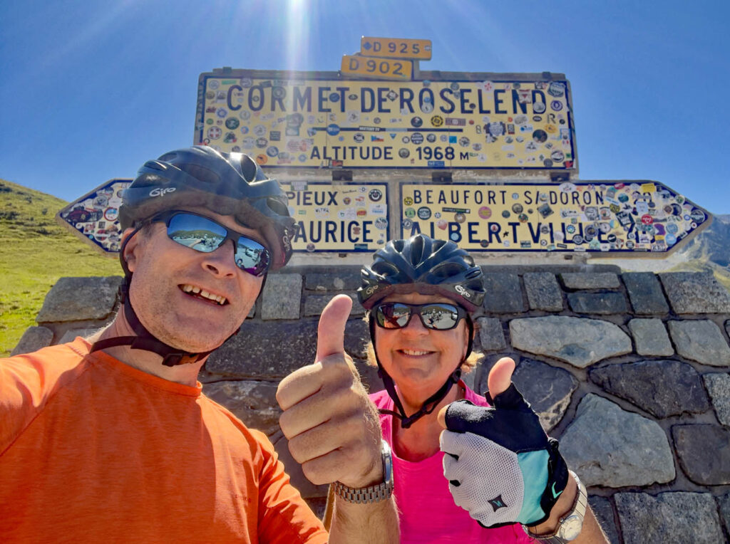 The last ten days of August have been less settled and less warm so we’ve been slightly more restricted in our trips. Before, we were heading high into the mountains seeking cooler air, but now we are in search of sunshine. As soon as we saw a forecast for two consecutive days of good weather we booked a hotel and packed our panniers ready for a cycle over the Cormet de Roselend and down into the beautiful little town of Beaufort. It was so chilly when we set off, freewheeling down the hill to Bourg-St-Maurice, that we had to stop in Seez for a warming coffee. Then the climb out of Bourg began and we soon warmed up as we cycled the 19km in glorious sunshine up to the Col.