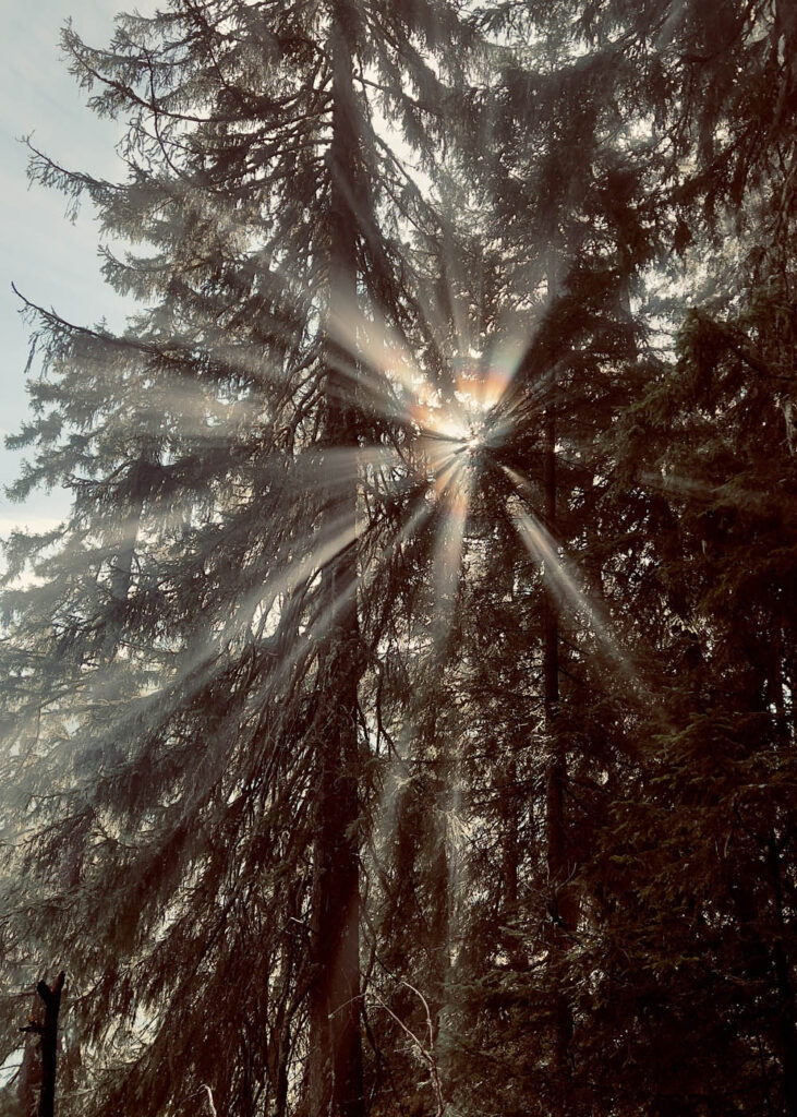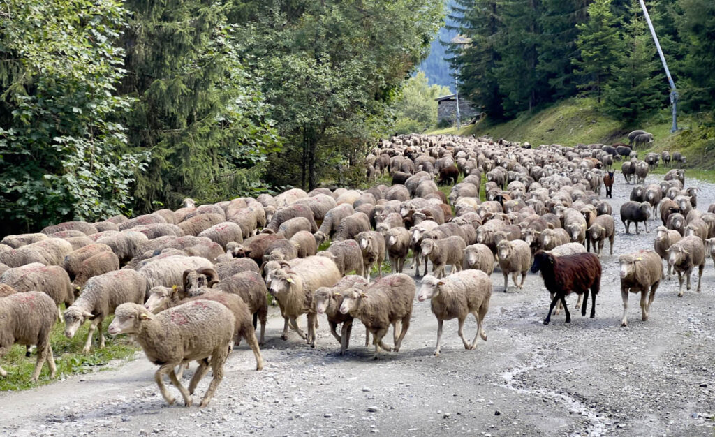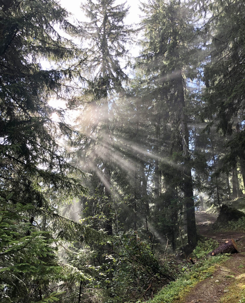 There have been quite a few misty, rainy days and this had brought a sprinkling of fresh snow to the higher ground. We’ve had some beautiful walks through the forest from Le Planay, just across the valley, towards Les Arcs. The first was to Pré St Esprit for lunch at Belliou Fumé. Low lying cloud gave a magical mist to the forest with shafts of sunlight breaking between the branches. On a second trip we went further, to Arc 1950, for lunch at the Vache Rouge – a favourite spot which we found in lockdown when they were serving take-away pizza and beer. It was the last day of the summer season and the holiday makers all seem to have disappeared from the mountains. But on the way home we found plenty of sheep!